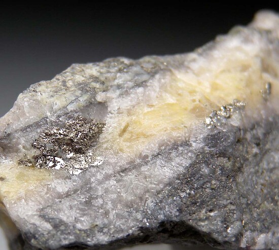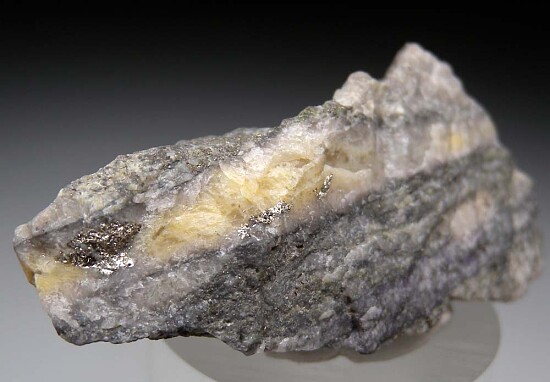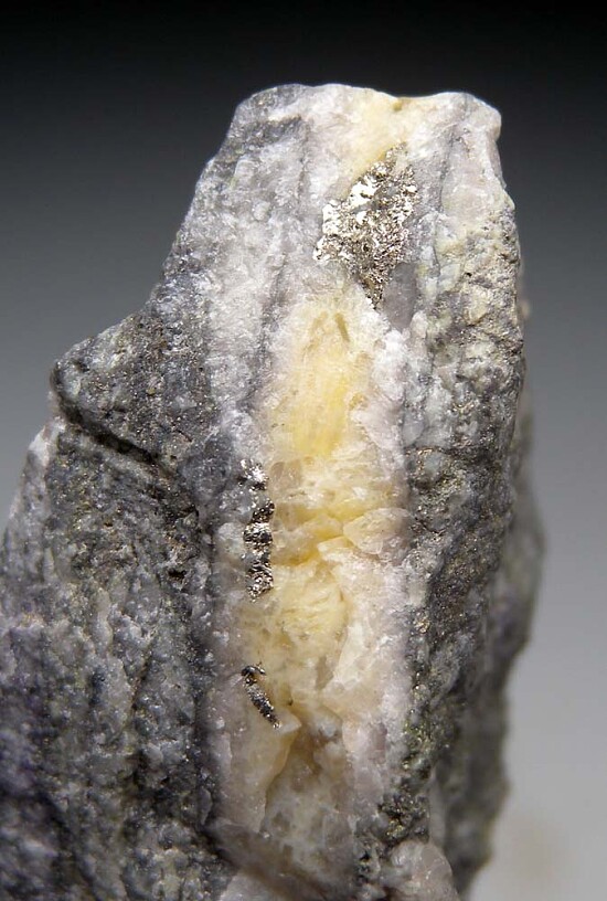Bright metallic Calaverite in a Quartz vein in rock matrix. Calaverite is is an uncommon telluride of gold with the chemical formula AuTe2. It was first discovered in Calaveras County, California in 1861. This specimen has areas of Calaverite to 5mm in size. The Quartz vein runds through the entire specimen and there is additonal Calaverite on the other side.