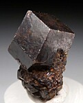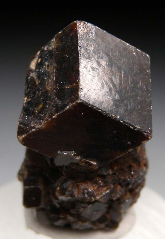 Larger 2cm Andradite crystal sitting atop a mass of smaller Andradite. The main crystal is chocolate brown and nearly complete all around and displays wonderfully. Excellent thumbnail for the locality.