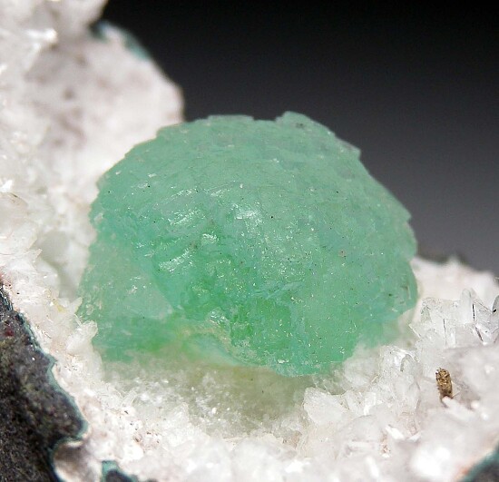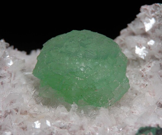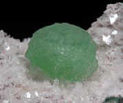 Spherical cluster of translucent green Apophyllite in a crystal lined vug in basalt.