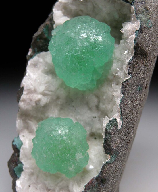 Pair of spherical clusters of translucent green Apophyllite in a crystal lined vug in basalt.