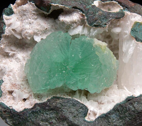 Translucent crystal clusters of green Apophyllite that contrast well against a light colored crystal lined vug in basalt. This is a beautiful miniature with a somewhat 'bow-tie' formation of two connected Apophyllite crystal groups well centered in the vug. There is also a white Stilbite crystal to the right of the Apophyllite. Saw cut on base. Valued at $200.