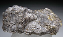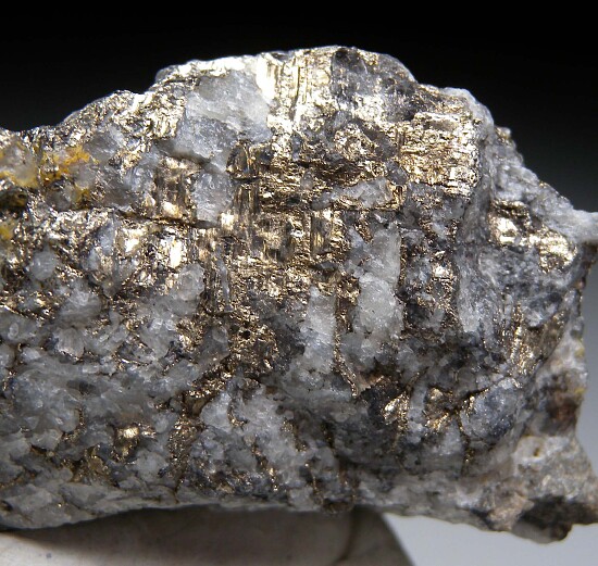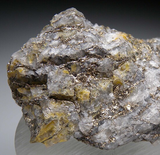 Rich specimen of Calaverite, a rare Gold telluride mineral, from Cripple Creek. Veins of solid Calaverite run all throughout the Quartz matrix with crystalized surfaces in areas. Lots of Calaverite in this one! Ex. Jerry Music collection.
