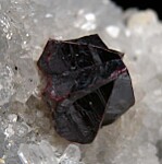 Classic Cinnabar penetration twin on drusy Quartz with Dolomite. The Cinnabar crystal is perfect and translucent red when backlit.