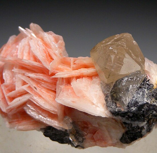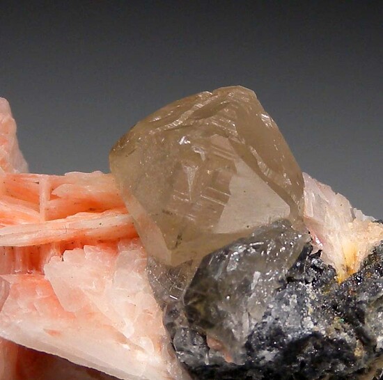 Glassy and lustrous 1.2cm Cerussite crystal with bladed pink Barite crystals and Galena. Love the color contrast!