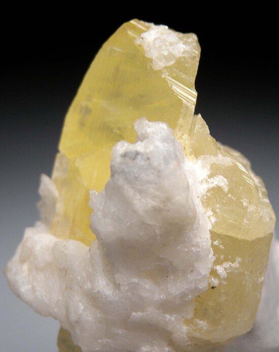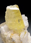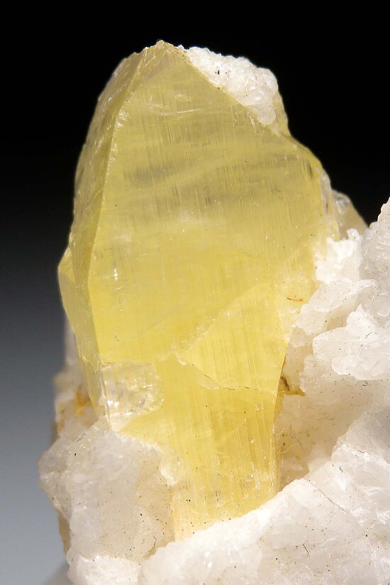 Single large crystal of translucent to transparent yellow Amblygonite intergrown with white Albite. Amblygonite is a rare lithium-aluminum phosphate species that is not commonly seen in fine display quality crystals. This crystal is well crystallized on the front and sides and contacted on the backside. Translucent with transparent gem areas. The front face shows light striations and the sides are smooth with high glassy luster. Good yellow color on this one.