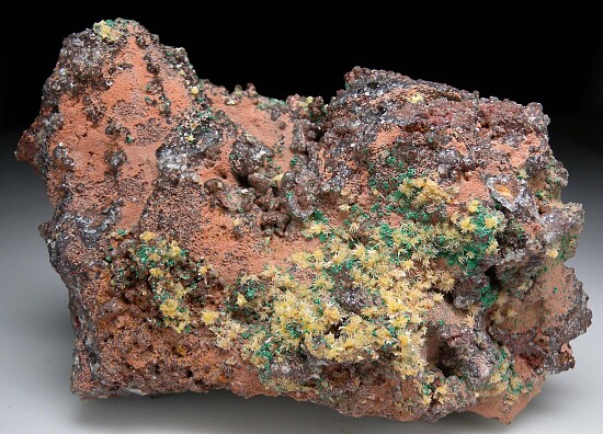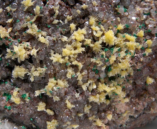 Large Tsumeb specimen covered by tiny clear Calcite crystals which are in turn sprinkled with small green Malachite spheres and starburst clusters of yellow Mimetite. Good coverage on both sides. Interesting old Tsumeb piece loaded with crystals and in great condition.