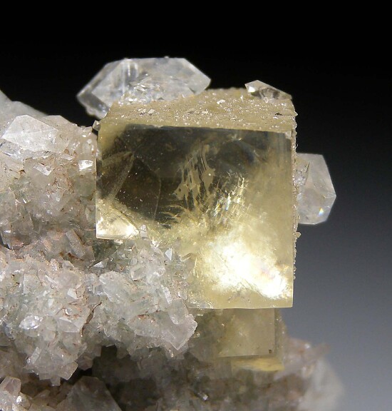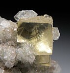 A GEM yellow Calcite crystal dramtically perched atop a central mound of Apophyllite crystals. There are Apophyllite crystals on the Calcite too, along with a second smaller Calcite. Showy, undamaged specimen and much better than photos which don't capture the dazzling transparency and brightness. Ex. Bert Ottens, Terry Huizing collections with each of their collection labels.