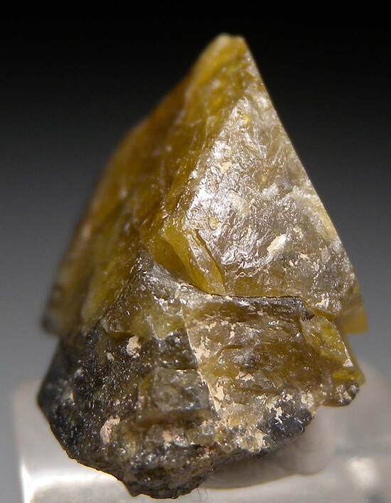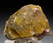Large single translucent yellow Microlite crystal from the Alto Ligonha pegmatites. Complete all around with some intergrown mica crystals.