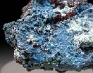 Specimen of sky blue Shattuckite on both sides of specimen from recent finds in Mexico. Chrysocolla and green Conichalcite are also present.