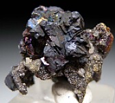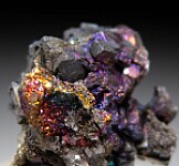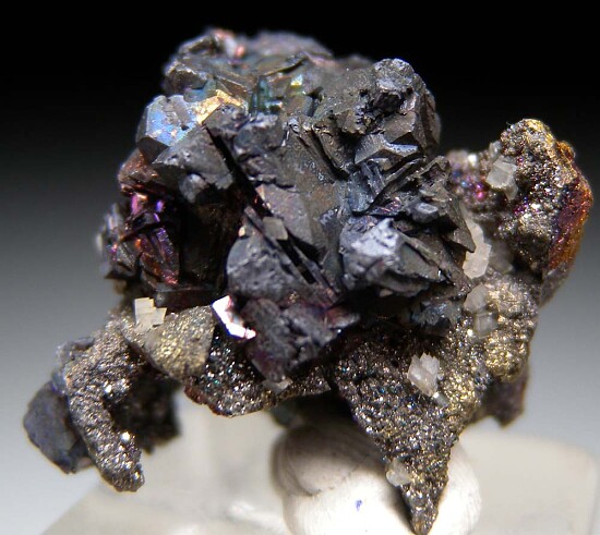 Iridescent modified cubic Galena crystals with colorful groups of micro Chalcopyrite crystals and a few small white Calcite crystals in association. Undamaged floater well crystallized all around. From old stock.