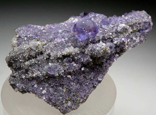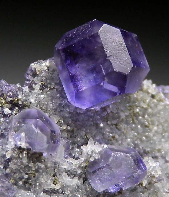 Transparent purple Fluorite from the Shangbao Mine in China. The specimen is composed of a thin matrix with Fluorite crystals on both sides. The Fluorite have the high quality and bevelled edges typical of this mine.