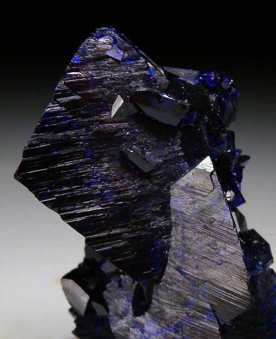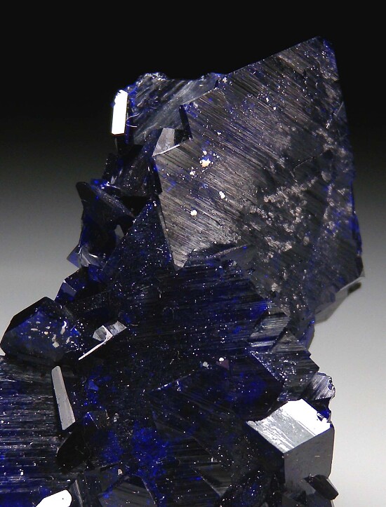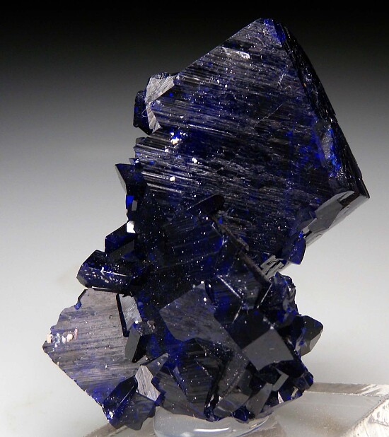 Cluster of deep blue, diamond-shaped crystals of Azurite from the Milpillas Mine. Complete all around and in near pristine condition with crystals to 3.2cm. Outstanding, showy specimen.