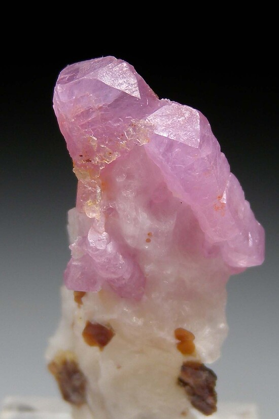Pink Sapphire crystal on a marble matrix with dark red mica crystals. The Sapphire measures 2cm in length, is translucent, and has good crystal form.