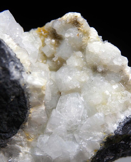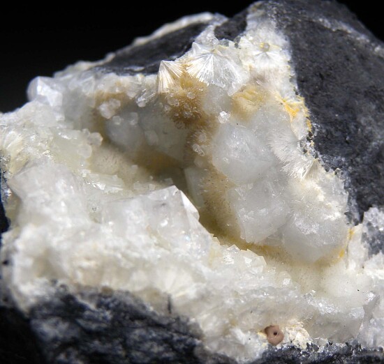 Shallow vugs loaded with yellow Wavellite and large crystals of Fluellite. The Fluellite crystals are good sized reaching 5mm in size. Fluellite is a rare phosphate mineral and the world's best were found at this old Gold mine in Nevada.