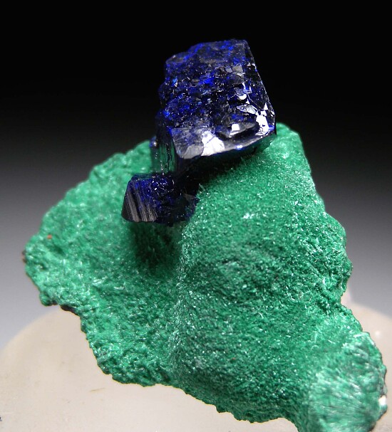 Two lustrous Azurite crystals on velvety Malachite from the now closed Milpillas Mine in Mexico. The largest crystal is 1.6cm in size.
