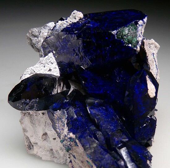 Crystals of Azurite partially pseudomorphed to Malachite from the now closed Milpillas Mine in Mexico. The Azurite has high luster and great 'electric blue' color with areas of velvety green Malachite. Despite the matrix contacting on some of the crystals, the incredible blue color and large, sharp crystals make this a stunning piece.