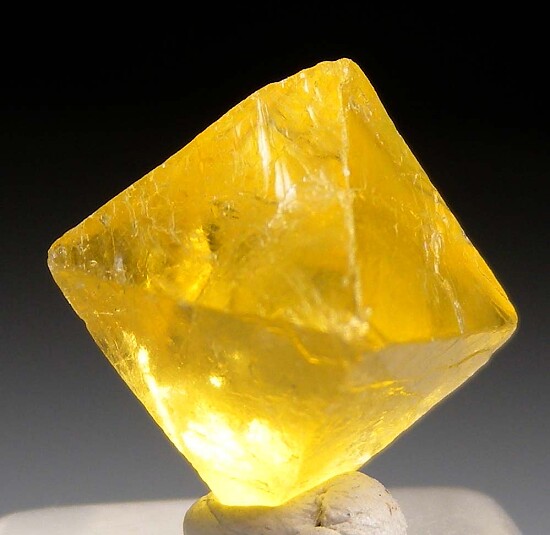 Gemmy bright yellow cleavage octahedron of Fluorite. Complete all around with great color. Old specimen I purchased in a midwest rockshop back in the 1970s.