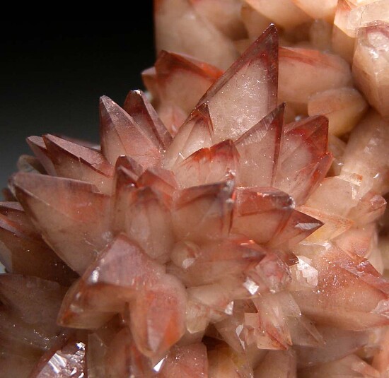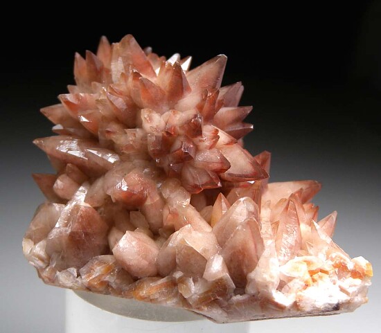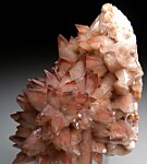 Scalenohedral or 'dog tooth' Calcite crystals colored red by Hematite. The central mound is covered with spikey crystals that project out in all directions.