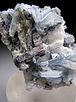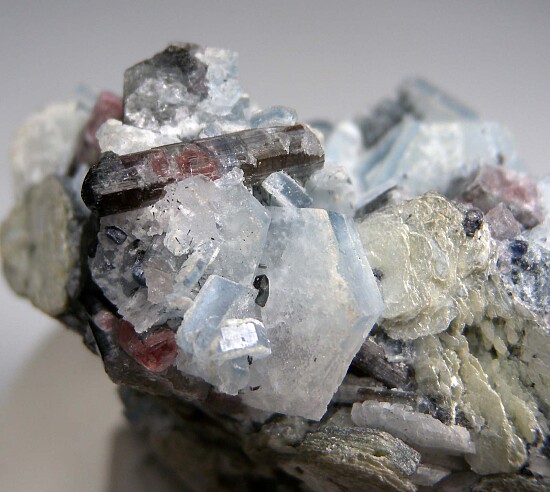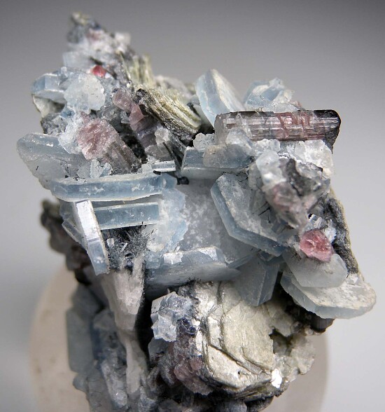 Intergrown cluster of tabular blue Alkali Beryl crystals, Tourmaline, and Mica. The Beryl crystals reach 1.3cm in size with glassy luster on the thin edges. The colorful Tourmaline crystals show light etching. Well crystallized all around. Note that these were once thought to be the Cesium rich species Vorobyevite but analyses did not show Cesium and this name has since been discredited.