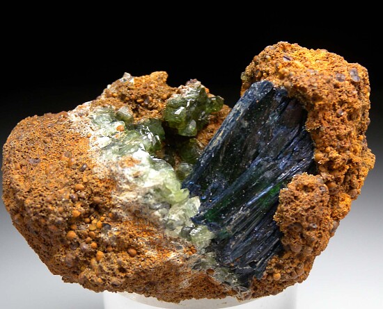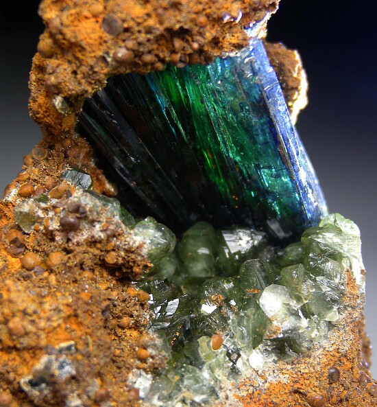Large open vug lined with glassy bright green Ludlamite crystals and transparent blue/green Vivianite crystals from a relatively new locality in northwestern Brazil. The Vivianite span the entire vug and show great color with lighting. Beautiful combination specimen of both species.