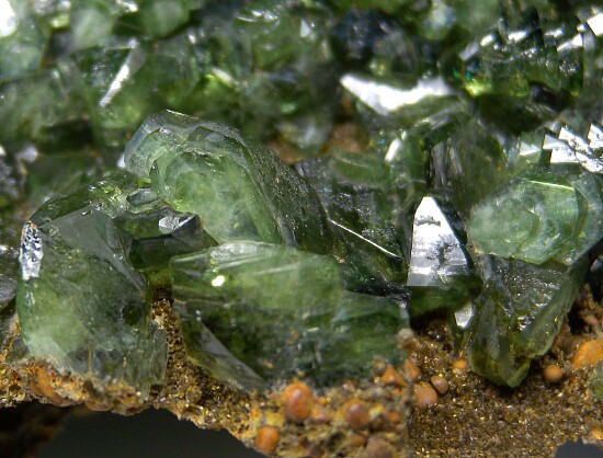 Large specimen of glassy bright green Ludlamite crystals on matrix from a relatively new locality in northwestern Brazil. The crystals are bright, translucent to transparent, and reach 1.5cm in size. Gorgeous specimen of exceptional quality for the species. Large and in great condition.