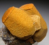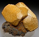 Shimmering golden crystals of Siderite and Sphalerite after Calcite from a well known, short lived find in South Africa. There are two double terminated crystals on matrix. The Siderite and Sphalerite formed as epimorphs over the Calcite which later dissolved away. Because they are hollow, most are damaged to varying degrees. This is an execellent example in pristine condition. Ex. Tim Sherburn collection.