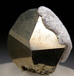 Complete highly lustrous single Pyrite crystal from the Merelani Tanzanite mines in Tanzania. This is a high quality, complete crystal (contacted on the bottom) showing the complex form these Pyrite crystals are famous for. The backside is coated by white Calcite. Ex. Tim Sherburn collection and comes mounted in a Perky box. Tim had access to a large number of these Pyrites as they were imported and was able to select the best.