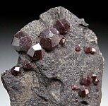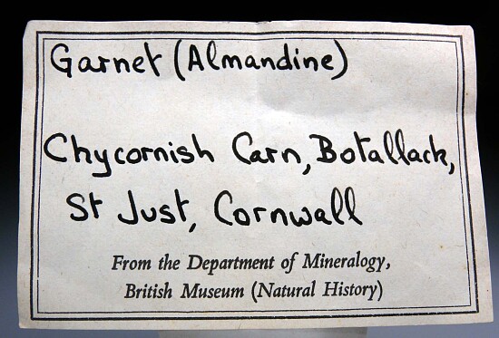 Well formed red Alamandine crystals to 7mm in a dark schist matrix. These are rare, hard to come by specimens from a one time find. Ex. Tim Sherburn collection and comes with an old British Museum label. Tim specialized in UK minerals and he told me these were the only UK garnets he was ever able to buy. A discussion of the find and locality is provided by MINDAT: In 1822, Carne notes: 'About six months ago, a mass of beautiful garnets, of a deep red colour, was found imbedded in the rock [in a footnote: The rock here appears to contain chlorite, as well as hornblende and quartz], not far from low water mark, at the foot of Chycornish Carn, about a quarter of a mile south of Botallack. Some of the crystals are larger than hazel-nuts, and most of them were twenty-four sided. Some specimens of a very superior order were procured, each having from one to two hundred crystals on its face.' There is, however, some debate about the true locality of these specimens, some of which are preserved in the collection of the British Museum of Natural History. Chycornish Carn is an isolated rock in the sea, about 40 yards off Crowns Rock, north-west of the Botallack mine. According to Carne, however, the specimens were recovered from a place located a quarter of a mile in the opposite direction. Whether this is just a simple mistake in the locality description is not known. Comparable specimens were never found again, neither at Chycornish Carn, nor anywhere else in the area around Botallack Mine. On the other hand, Carne's report suggests that the locality was collected out, a fact which still leaves Chycornish Carn as the possible location.For these reasons, the locality is listed with a question mark. The grid reference is that of Chycornish Carn. Alderman (1935) characterised specimens of these garnets in the Carne Collection at the University of Cambridge. He mentioned that (Sir) Arthur Russell succeeded in discovering the original spot where these garnets were obtained, and that all the garnet specimens have been removed, save for traces. Russell indicated the location was near the low water mark on the cliffs close to Zawn a Bal, between the Crowns and Wheal Edward. Analysis of the garnets showed them to be unusually rich in the almandine component with 91.33% almandine, 1.69% spessartine, 2.35% pyrope and 4.63% grossular.
