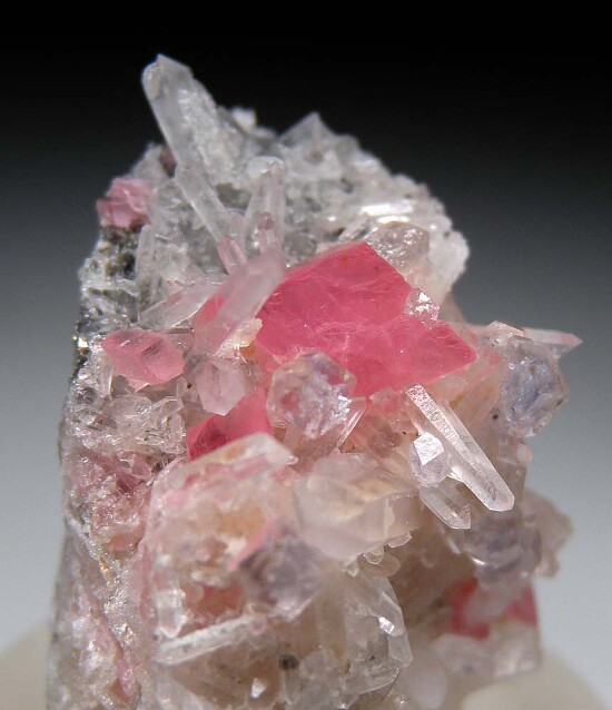 Translucent to transparent rhombic Rhodochrosite crystals and purple Fluorite crystals on needle Quartz. This specimen has Rhodochrosite on two sides. One side has a 9mm Rhodchrosite crystals and multiple Fluorite crystals in Quartz. The other side has a larger 1.2cm Rhodo crystal.