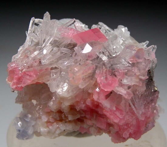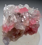 Translucent to transparent rhombic Rhodochrosite crystals and purple Fluorite crystals on needle Quartz. The best Rhodochrosite crystal is 7mm in size.