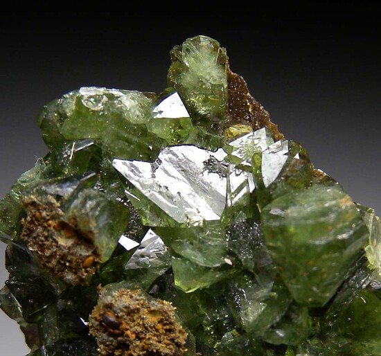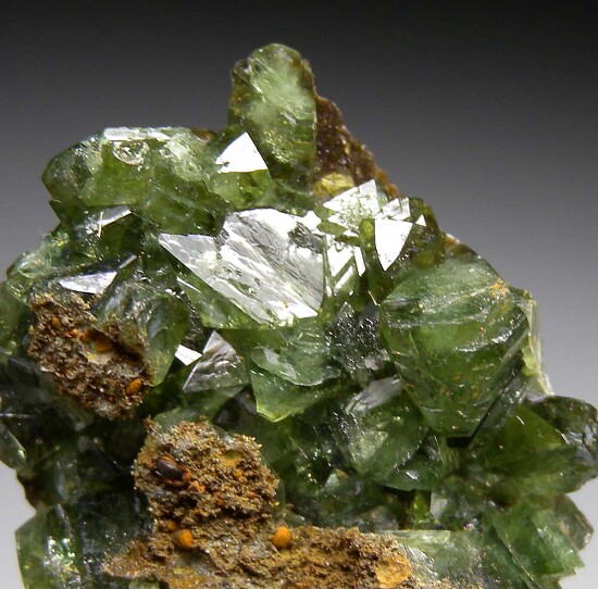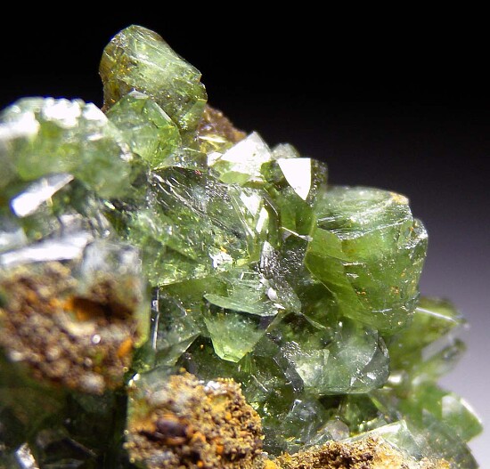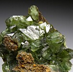 Glassy bright green Ludlamite crystals on matrix from a relatively new locality in northwestern Brazil. The crystals are bright, translucent to transparent, and reach 8mm in size.