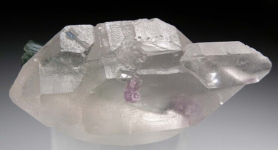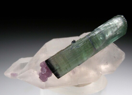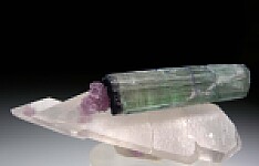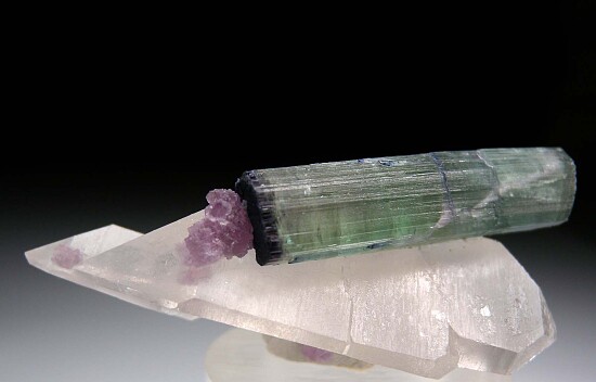 Doubly-terminated Quartz crystal with an attached doubly-terminated blue/green Tourmaline crystal. This is a classic and aesthetic Brazilian Tourmaline combo. The Tourmaline is 3.4 x 0.8cm in size and transparent to translucent. Purple Lepidolite adds color contrast. The crystal has one repair and was reattached to the Quartz crystal.