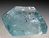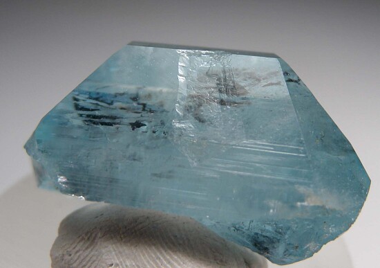 Glassy blue single Euclase crystal from the La Marina Mine in Columbia. Complete all around with good transparency and a high glassy luster. Undamaged and perfect all around with a very shallow contact from another crystal on the back side.