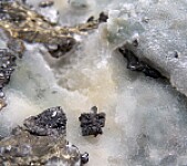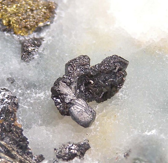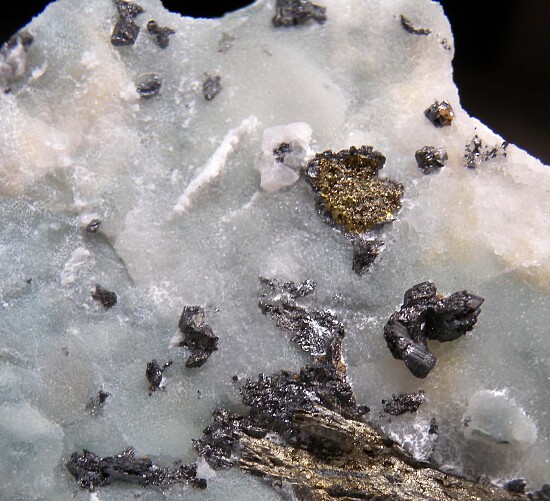Blue/green matrix covered by a layer of drusy Quartz hosting larger, brassy crystals of Pyrrhotite and smaller black crystals of Miargyrite from an old Gold and Silver mine in Nevada. Excellent for the species with well formed Miargyrite crystals to over3mm in size and crystal groups to 6mm wide. Miargyrite is a rare silver sulphosalt species.