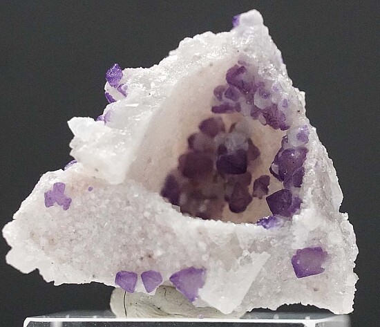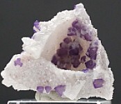 A really interesting specimen comprised of a white Quartz epimorph after Calcite that has later been partially coated by purple Fluorite crystals. The Fluorite crystals have grown on both the outside and the inside of the epimorph.