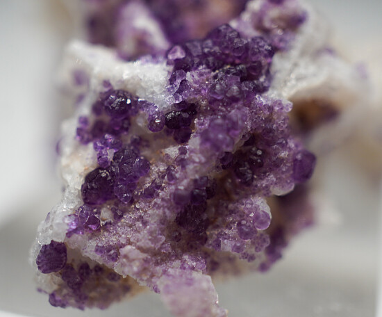 A really interesting specimen comprised of a white Quartz epimorph after Calcite crystals that has later been partially coated by purple Fluorite crystals. The Fluorite crystals have grown on both the outside and the inside of the epimorphs.