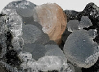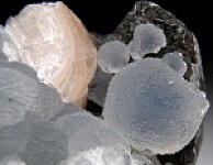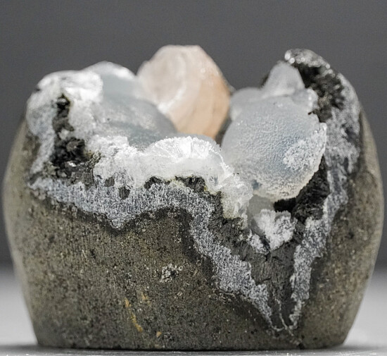 Translucent, globular masses of Epistilbite lining an open vug in basalt. In addition to the Epistilbite, there is a single crystal of pink Heulandite. The specimen was carved out of solid basalt leaving the vug intact. Epistilbite is one of the more rare zeolites from India and not often seen for sale. The base is carved flat for perfect display. Valued at $250.