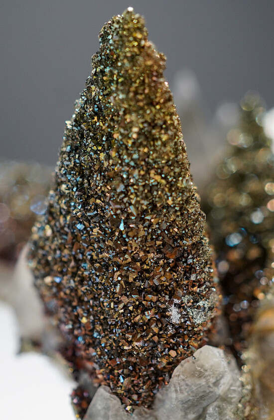 Scalenohedral Calcite crystals partially coated by sparkling irridescent Chalcopyrite crystals. Fine quality undamaged crystals to over 3cm in length.