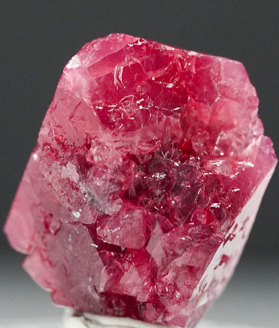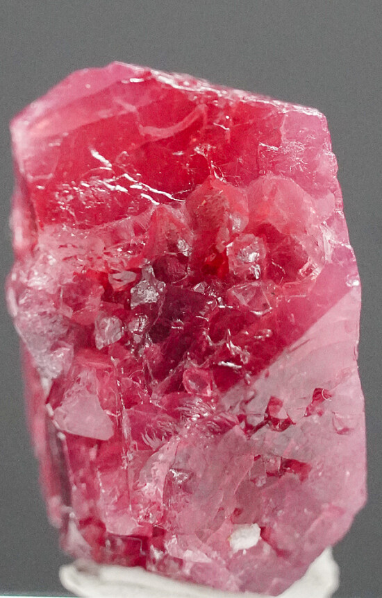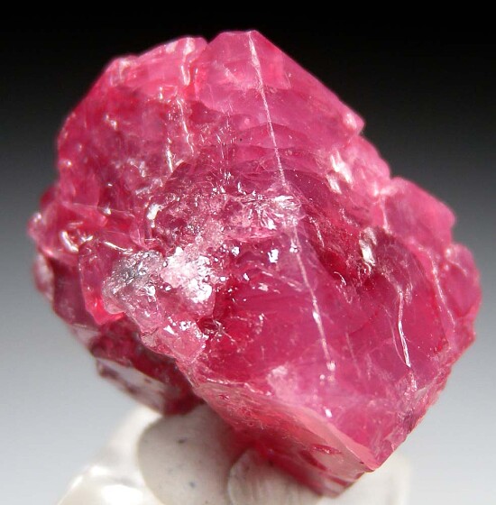 Pinkish red single Spinel crystal from Mahenge. This is a really nice single octahedral crystal that is complete all around with chipping on two tips, otherwise perfect. High luster and translucency with typical stepped surface growth features in areas. Valued at $100-$150.