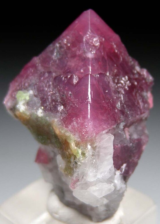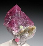 Purple/pink Spinel in white Calcite from Mahenge. A nice single octahedral crystal that displays well atop the Calcite. The addition of some green Pargasite and a smaller birght pink 3mm Spinel in the Calcite combine to make this a colorful specimen.