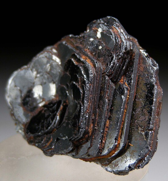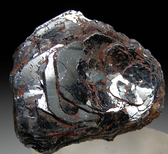 Bright, metallic cluster of Hematite from the Rodrigo Silva district in Brazil. The Hematite occurs as parallel-growth, hexagonal crystals forming what is known as an 'Iron Rose'. The specimen is complete all around with minor edge wear and bright, mirror-lustrous faces on front and back with more matte luster along the edges. This is old stock purchased in Brazil by dealer Steve Perry back in the 1990s. The camera picks up more red color than you notice in person - in your hand it's a bright silvery metallic, flashy group of crystals. Valued at $250.