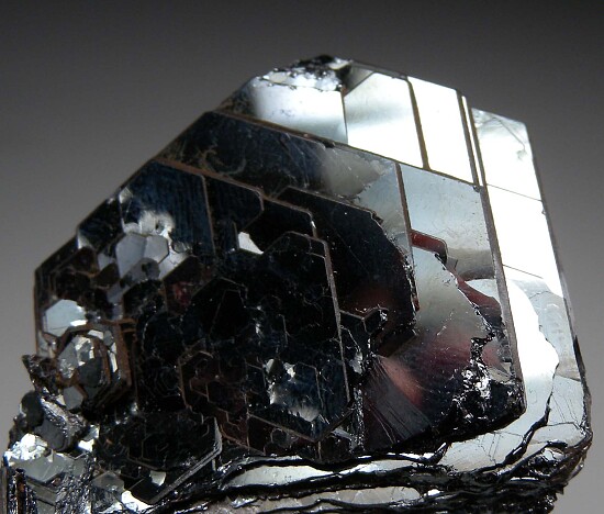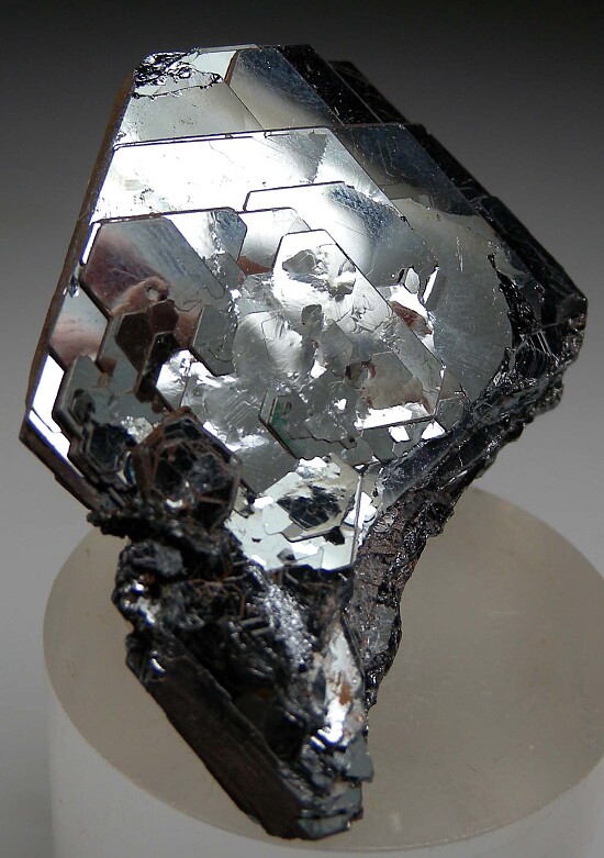 Bright, metallic cluster of Hematite from the Rodrigo Silva district in Brazil. The Hematite occurs as parallel-growth, hexagonal crystals forming what is known as an 'Iron Rose'. The specimen is complete all around with minor edge wear and bright, mirror-lustrous faces on front and back with more matte luster along the edges. This is old stock purchased in Brazil by dealer Steve Perry back in the 1990s.
