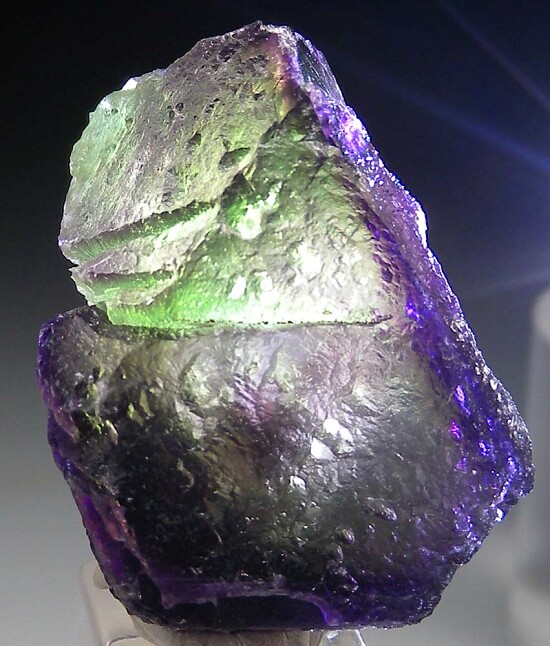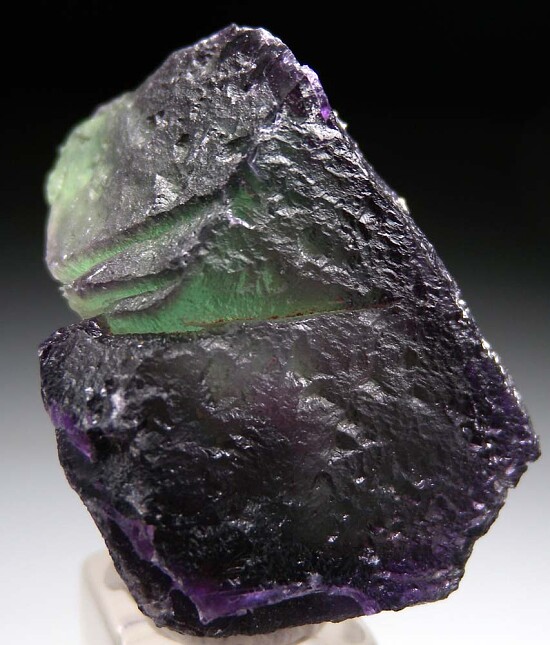 Single octahedral Fluorite crystal from the Surprise Mine in New Mexico. The Fluorite is an intensely colored purple over a pale green core. This specimen was mined in 2014. A brief description of this find was presented in Tom Moore's report in the Jan/Feb 2015 issue of the Mineralogical Record.