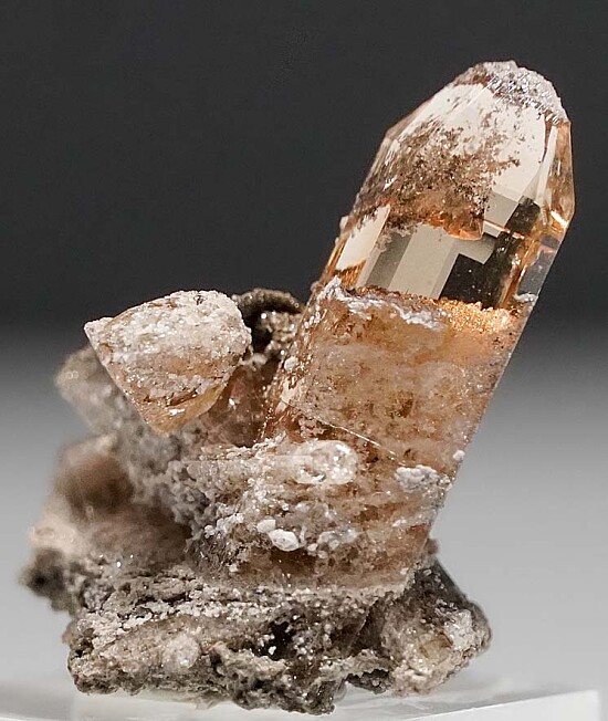 Glassy, transparent golden Topaz from the Maynard (Bixby) Mine in Utah. Complete and undamaged gem crystal cluster on a Rhyolite matrix. Stunning specimen mined in 2003 by John Sulzbach. Ex. John Sulzbach collection.