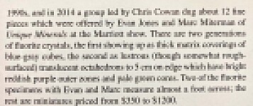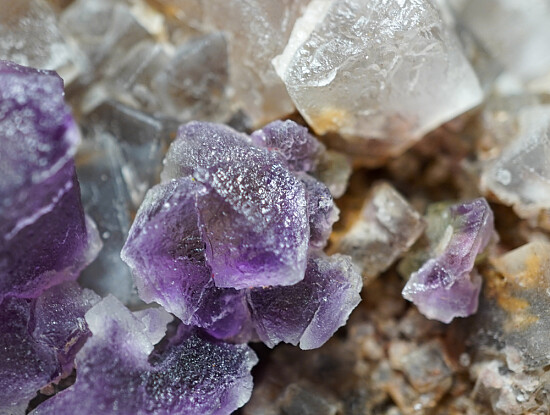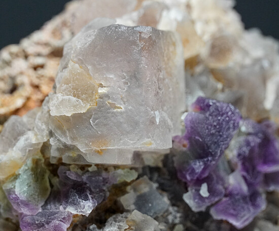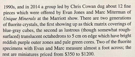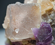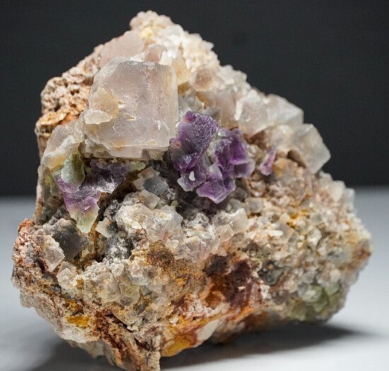 Octahedral and cubic Fluorite crystals on matrix from the Surprise Mine in New Mexico. The second generation of Fluorite occur as intensely colored purple crystals with green cores with individual crystals to 1.2cm on edge. The purple crystals formed over an earlier generation of blue/grey cubic Fluorite. The largest Fluorite cube is 3.5cm wide. This specimen was mined in 2014. A brief description of this find was presented in Tom Moore's report in the Jan/Feb 2015 issue of the Mineralogical Record. Ex. John Sulzbach collection and valued at $275.
