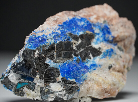 Bright blue Linarite and dark grey Galena in matrix. A colorful and interesting piece with nice crystallization and color on all sides.