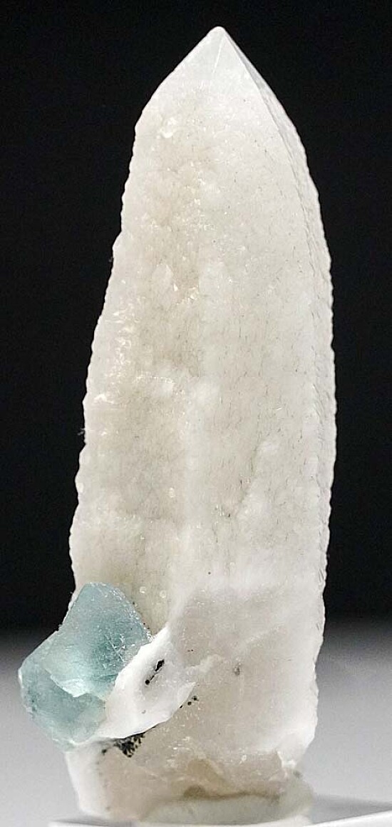 Single Quartz crystal from the Huanggang Mine with attached translucent green Fluorite crystals. The Fluorite are two intergrown octahedrons to 1.1cm in size. The Quartz is complete all around and perfect with thousands of tiny step faces all over the surface giving a somewhat satiny sheen.