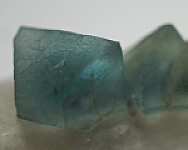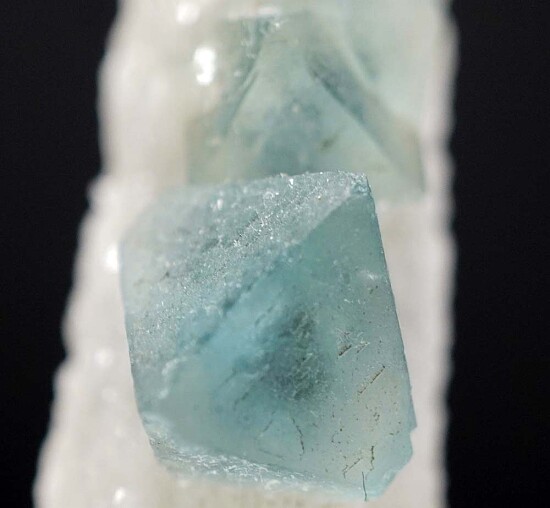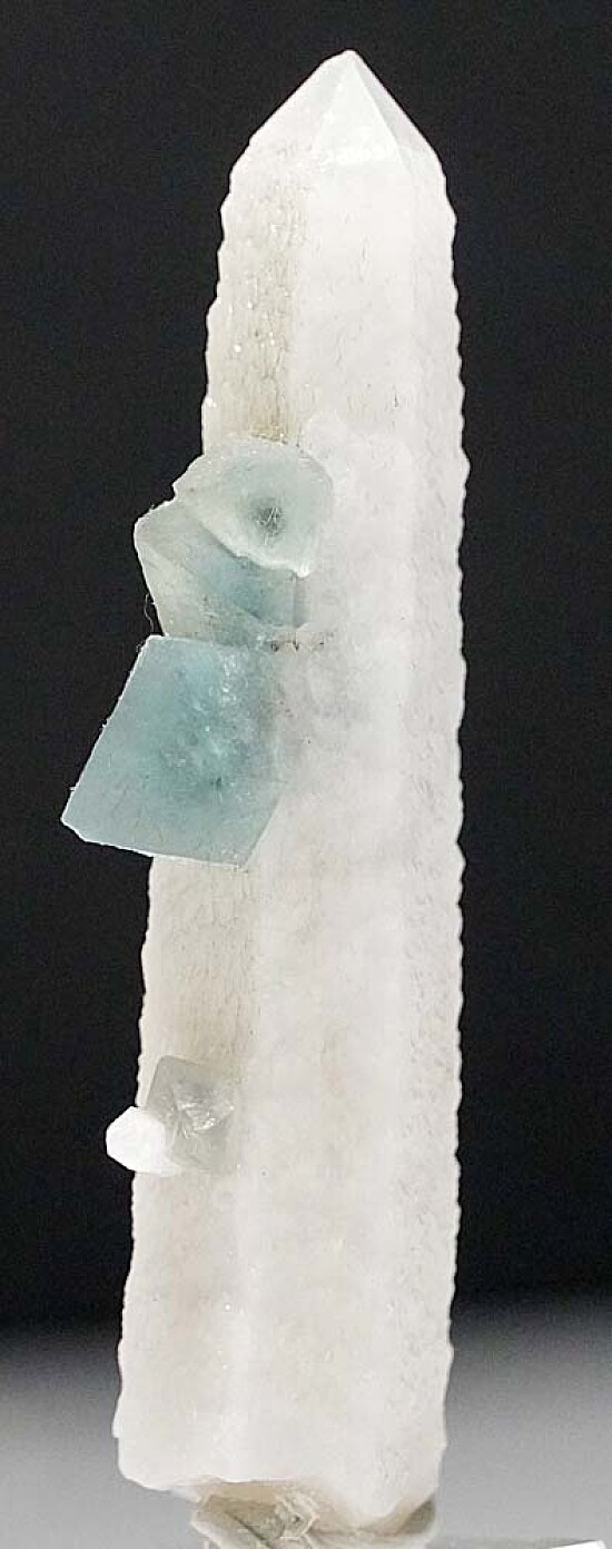 Single Quartz crystal from the Huanggang Mine with attached translucent green Fluorite crystals. The Fluorite are four octahedrons to 1.1cm in size. The Quartz is complete all around and perfect with thousands of tiny step faces all over the surface giving a somewhat satiny sheen. Great specimen!!