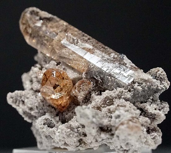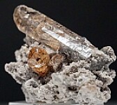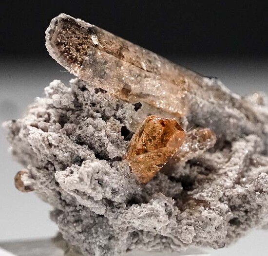 Well balanced specimen of Topaz crystals on Rhyolite matrix. The Topaz are gemmy and undamaged. There are small crystals rising up around the bottom with a larger 3.2cm crystal crossing over the top.
