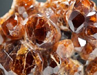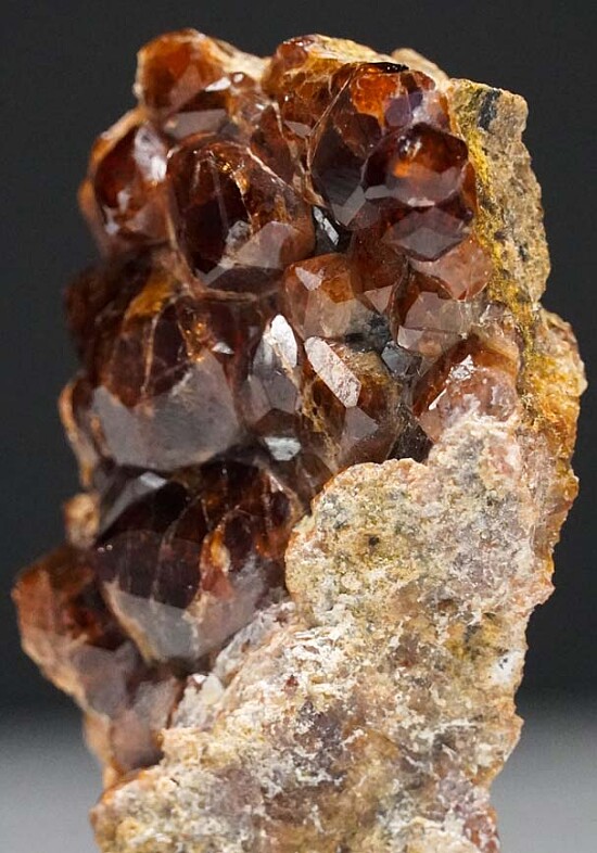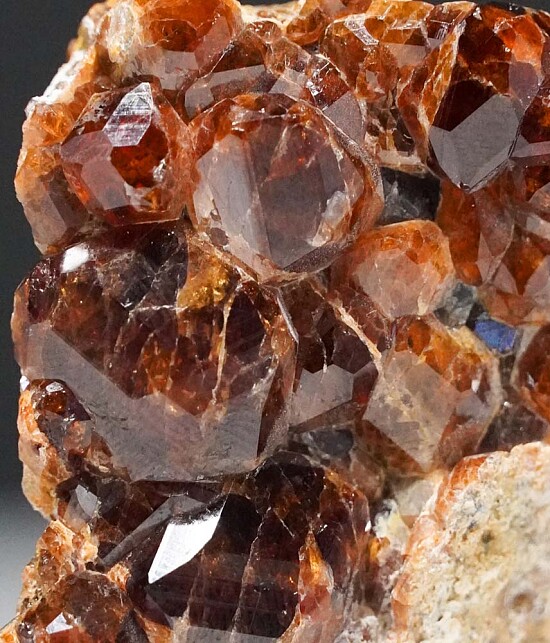 Cluster of highly lustrous orange/brown Andradite crystals on matrix. Individual crystals reach 1.7cm wide.